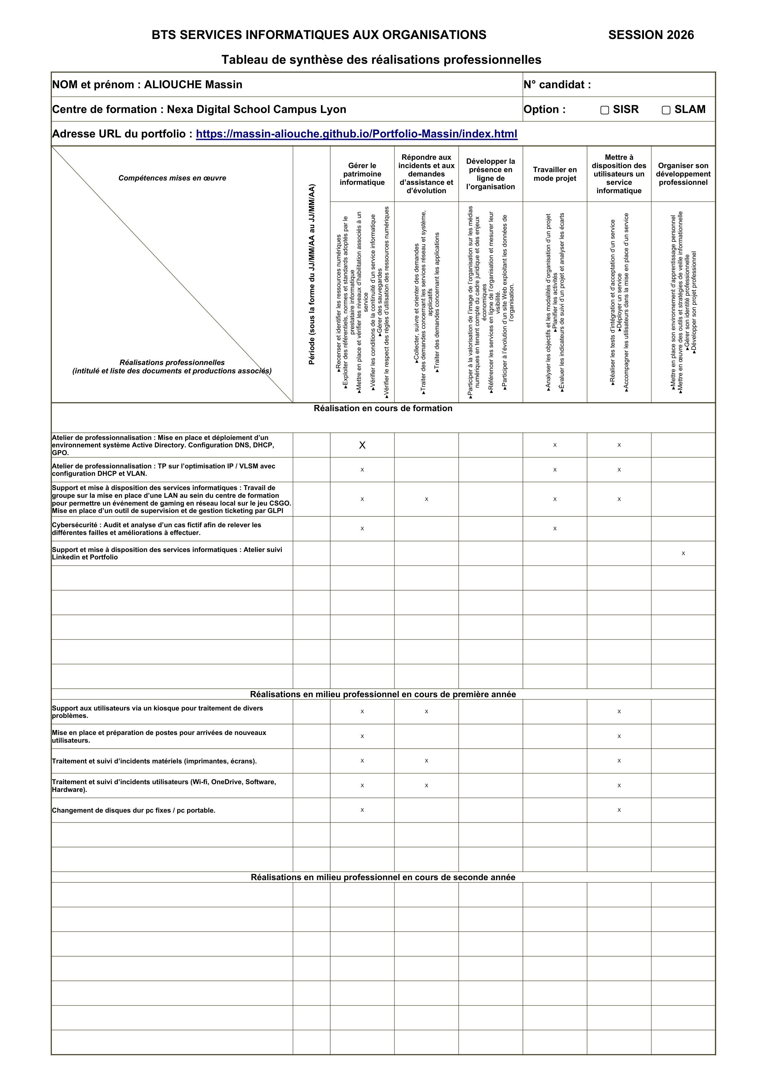 Tableau récapitulatif de mes compétences acquises en BTS SIO SISR - Cliquez sur le lien du portfolio pour y accéder